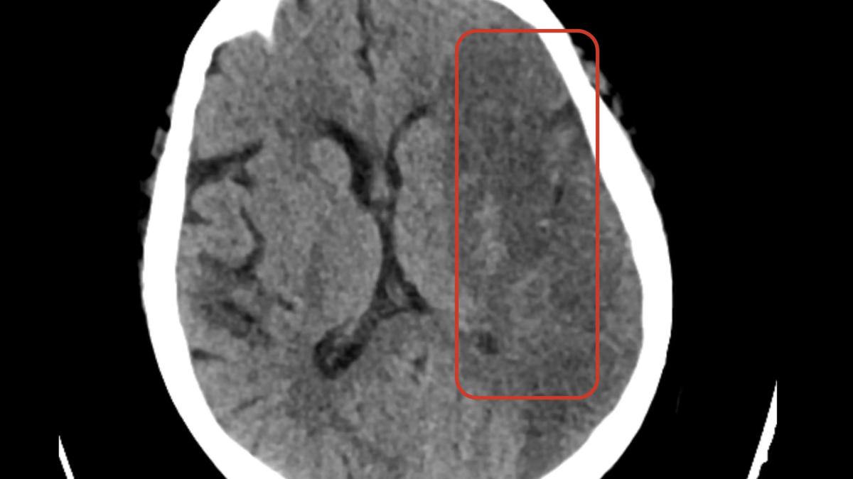 Femeie, 71 ani. Simptome neurologice ușoare, intermitente. CT-ul cerebral pare normal la prima vedere – modificările ischemice acute sunt adesea subtile în primele ore.